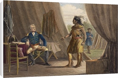 Cheap Canvas Print of JACKSON a WEATHERFORD. General Andrew Jackson taking the surrender of Chief from Granger Art on Demand. 18 x12 Canvas Print, White Sides. showing JACKSON a WEATHERFORD. General Andrew Jackson taking the surrender of Chief. JACKSON a WEATHERFORD. General Andrew Jackson taking the surrender of Chief William Weatherford after the defeat of the Creek Native Americans at the Battle of Horseshoe Bend, Alabama, 27 March 1814. Color engraving, 19th century. Chosen by Granger Art on Demand. Photo printed on archival quality canvas. Laminated. CanvasCANVAS PRINT This 18 x12 Canvas Print features an image of... >> Learn more »